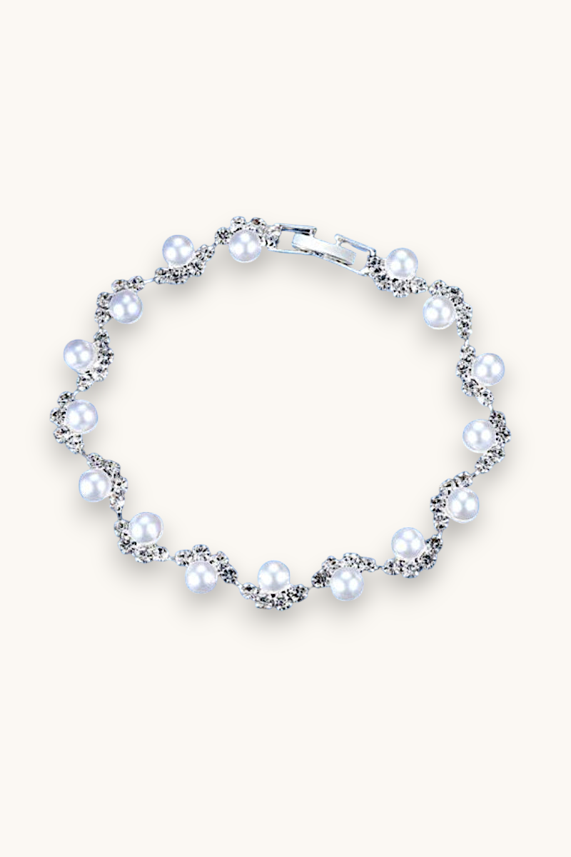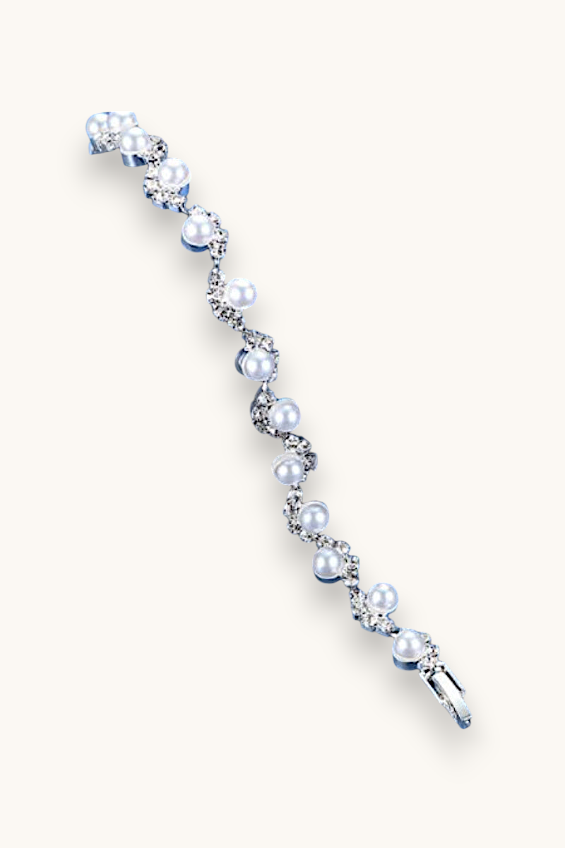 This elegant bracelet is a luxurious and delicate accessory designed for brides or special occasions. This piece of jewelry captivates with its refined design, adorned with classic pearls and clear decorative crystals. These elements subtly shimmer in the light, adding a touch of luxury and romantic charm to the look.